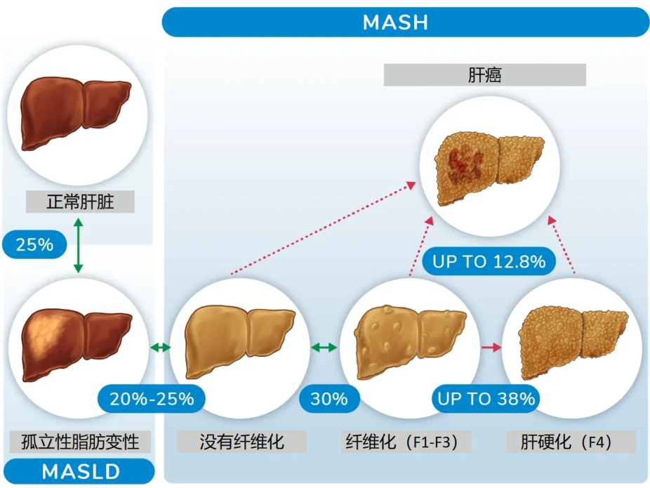 MASLD疾病譜包括單純性脂肪肝(MAFL)、脂肪性肝炎(MASH)及其相關纖維化和肝硬化。隨著肥胖和2型糖尿病(T2DM)的流行,全球MASLD患病率和發病率不斷增高。據報道,全球MASLD的發病率約20-35%,其中約10-30%的患者患有MASH。