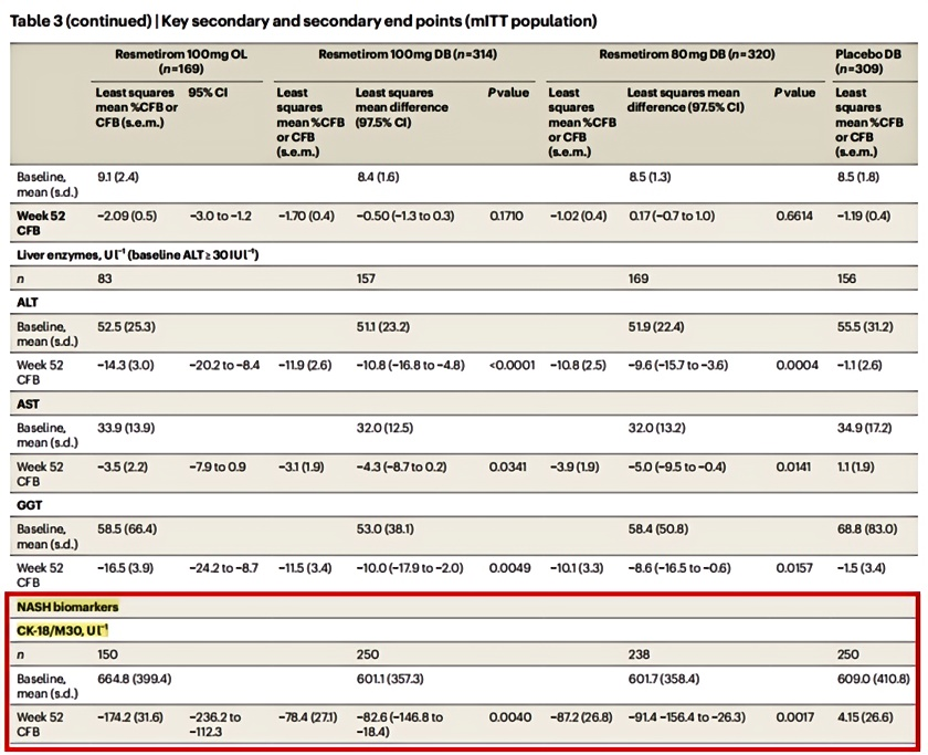 在接受Resmetirom不同劑量的治療組中,CK18的下降幅度顯著高于傳統肝功能標志物[2]